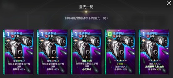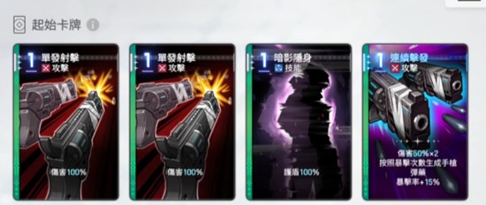 路克的基础卡牌配置由两张一费攻击和一张一费护盾构成,符合其五星品质的资源定位。其中核心输出卡为“连续激发”,消耗一费可进行两次50%伤害的攻击,每次暴击都会生成一张手枪弹药,并提升自身15%暴击率。这意味着当路克面板暴击率达到85%时,该技能即可实现必暴,配合无需消耗即可使用的四类手枪弹药卡,能在短时间内打出高频单体伤害。这些弹药卡均带有蒸发或消灭词条,虽然单次伤害偏低,但胜在零费可用且触发灵活。
