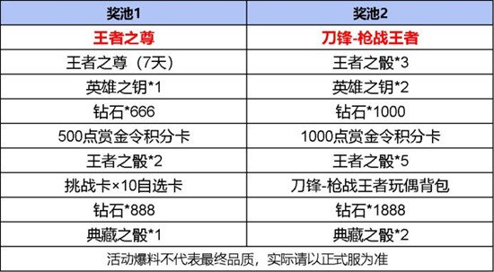 活动共分为两个独立奖池,奖池中的道具都非常实用,除了王者之尊以及刀锋-枪战王者外,将两个奖池全部抽完可获得3把英雄之钥、4442枚钻石、1500点赏金令积分卡、13枚王者之骰、3枚典藏之骰、10张挑战卡自选卡等道具,这波福利够不够狂欢!