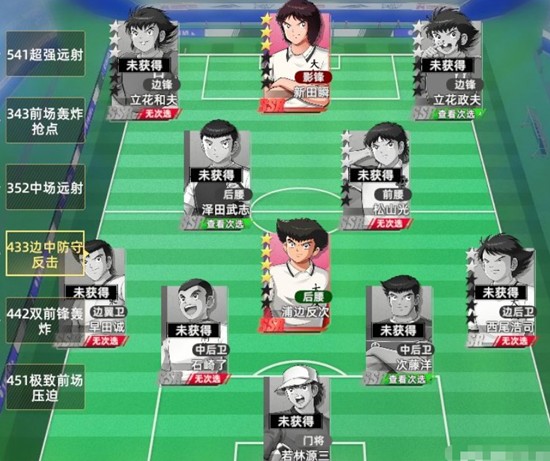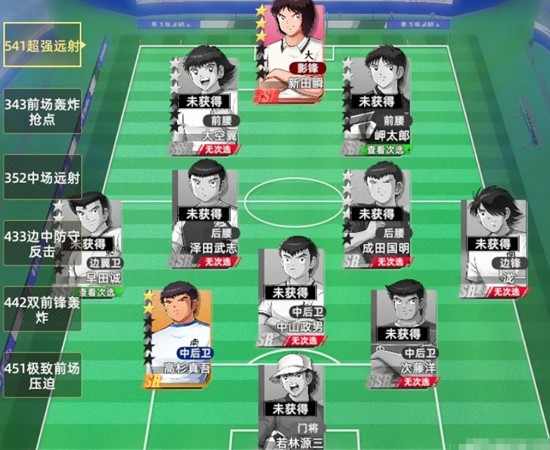 这套阵容采用5-4-1阵型,核心思路是围绕中场展开进攻循环。太空翼作为前腰具备极强的远射能力,配合泽田武志和岬太郎在中场的调度与支援,能够形成持续的远距离打击。前后腰位置的球员均具备远射属性,在比赛中可频繁尝试外围发炮。该阵容的优势在于前期就能建立进攻节奏,当中场远射被对手限制时,可通过前腰球员与中锋之间的联动转换为阵地攻坚。