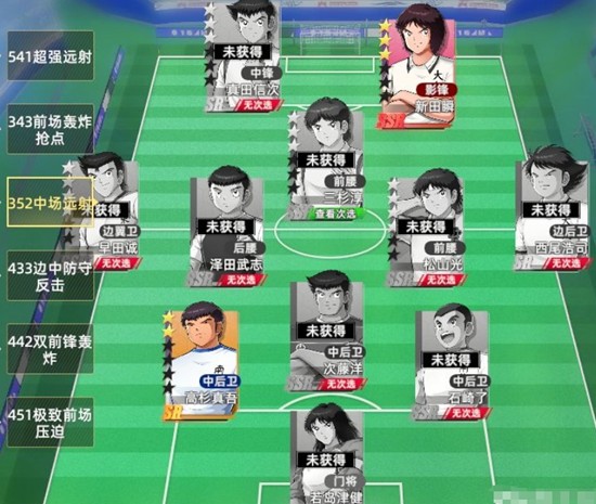使用3-5-2阵型构建的中场控制型阵容,主打中场多点远射威胁。三杉淳作为组织核心能稳定输出高质量远射,松山光在后腰位置提供防守覆盖的同时也具备远射技能,早田诚则承担边路突破与内切任务。中场三人组形成攻防闭环,前腰与边翼位球员的动作衔接流畅。一旦对手压缩禁区,隐锋或中锋可迅速前插完成抢点,配合迎风近射技能完成终结。