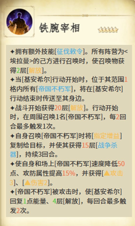 基安希尔的个性天赋名为铁腕宰相,这一被动能力使其在队伍中具备显著的阵营增益效果。当铃兰之剑中的埃拉曼阵营成员被召唤时,召唤物所携带的状态能够得到进一步释放与强化。只要基安希尔进入战斗,他周围一格范围内的帝国不朽军单位便可被主动传送到其身边,这一机制不仅提升了队伍的站位灵活性,也增强了群体协作的作战效率,尤其适合用于集中布阵或快速构建防线。