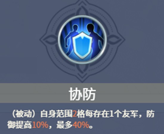 协防技能则侧重于提升团队防御能力。当基安希尔周围两格内存在敌方单位时,每有一名敌人,他就能为友军提供10%的防御加成,最多叠加四层,即最高可达40%的防御提升。这意味着在被敌方包围或处于密集交战区时,基安希尔能有效增强己方前排的生存能力。该被动在团战中尤为实用,尤其适合搭配其他近战单位形成稳固阵型。