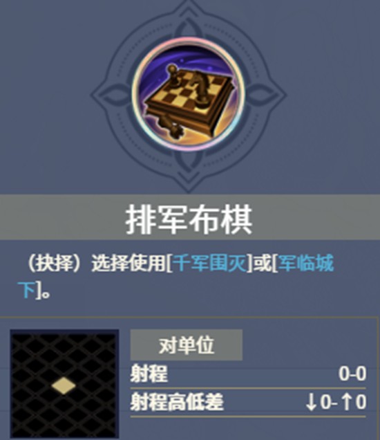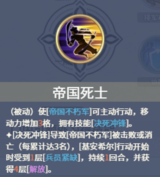 当基安希尔晋升至3阶,将面临帝国死士与排军布旗的技能选择。帝国死士允许其周围的帝国不朽军在行动时获得额外3格移动范围,大幅增强机动性。此外,使用冲锋类技能击败敌方单位后,基安希尔将触发兵员紧缺效果,并积累四层解放状态,为后续行动提供持续增益。相较之下,排军布旗仅在千军围灭与君临城下之间提供射程调整,功能性较为单一,因此多数情况下推荐优先选择帝国死士以提升整体作战节奏。