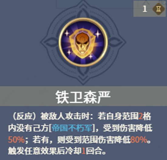 到达5阶后,忍耐与铁卫森严成为关键抉择。忍耐可在基安希尔受到持续伤害时减免50%的伤害量,有效应对dot类技能。而铁卫森严作为反击类技能,在受到攻击时根据周围帝国不朽军数量决定减伤比例:无单位时减伤50%,有单位时范围伤害减免提升至80%。考虑到基安希尔常与帝国不朽军协同作战,铁卫森严的实际覆盖率更高,防护表现更为稳定,因此更推荐在高阶培养中选用此技能。