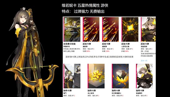 维诺妮卡是五星热情属性的游侠,以其强大的过牌能力和无费输出模式著称。她在过牌体系队伍中常担任主C角色,也能在多种阵容中胜任副C位置。其技能循环流畅,资源利用率高,能够在不依赖额外费用的情况下持续输出。凭借出色的卡牌调度能力,维诺妮卡在卡厄思梦境的多种战斗场景中都展现出超群的适应性与稳定性,是中后期不可或缺的核心战斗员之一。