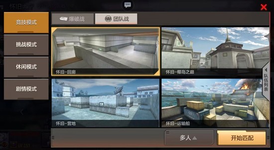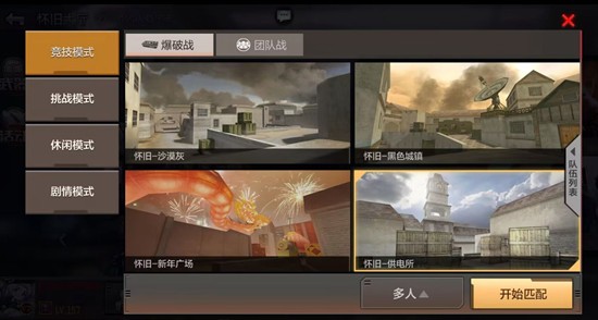 竞技模式是大部分玩家接触最多的模式,怀旧模式中的竞技模式分为爆破战和团队战。其中爆破战有四张地图,分别为:怀旧-沙漠灰、怀旧-黑色城镇、怀旧-新年广场、怀旧-供电所;