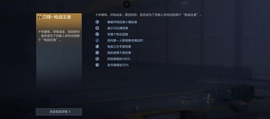 在实战性能方面,刀锋枪战王者具备一定的杀伤力,能够在CF手游对局中发挥作用。它还能在爆破模式中提供小幅移速加成和闪光弹效果减免,同时配备了个性化语音和专属第一人称视角动作。使用这把武器时,玩家在CF手游中可获得额外经验值和金币加成,高处掉落也不会受到伤害。