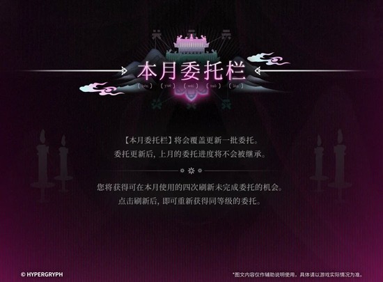 【本月委托栏】将会覆盖更新一批委托。委托更新后,上月的委托进度将不会被继承。