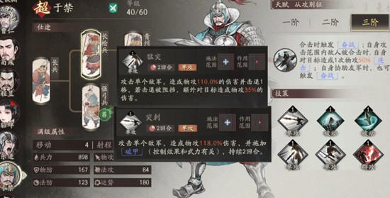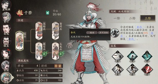 于禁在三国望神州中的核心定位是远程骑兵输出,拥有极强的破防与连击能力。其三阶技能“奋战”可无视敌方75%防御,极大提升输出效率。在触发合击技时,还能额外造成基于自身物理攻击50%倍率的连击伤害,这一机制使得于禁必须与副将形成良好配合,以最大化战场输出。因此,在兵种编队时需优先考虑能协同触发dot与合击效果的单位。