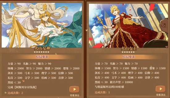 火山的女儿手机版共有四个结局大类,其中包含多个星级分支结局。最高星级为7星的火山女神结局,属于君临路线下的顶级成就,需要在特定剧情节点完成指定任务才能解锁。6星的火山女王结局同样属于高难度路线,其余如剑术勇者、研究大学者、舞蹈剧院明星、文学大文豪等职业类结局则分布在力量、智慧、魅力、艺术等不同成长路径中,每条路线均有对应的五星高星结局。这些结局统称为“真结局”,需满足严格的属性与事件条件方可达成。