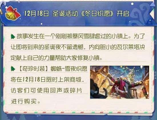 第五人格全新主线版本活动【昨日之笼】现已正式开放,限定剧情、全新时装与丰厚任务奖励正等待访客解锁年度重头戏“春节版本”前瞻直播定档12月19日18:00,届时将一次性曝光春节限定时装、新玩法、版本福利及更多惊喜,直播全平台同步放送。