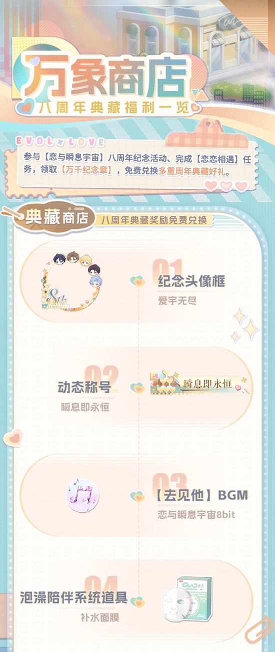 以上就是恋与制作人万象商店:八周年&往期周年典藏奖励兑换的全部内容了,更多游戏资讯,攻略内容敬请关注切游网,您的支持是我们努力的动力!