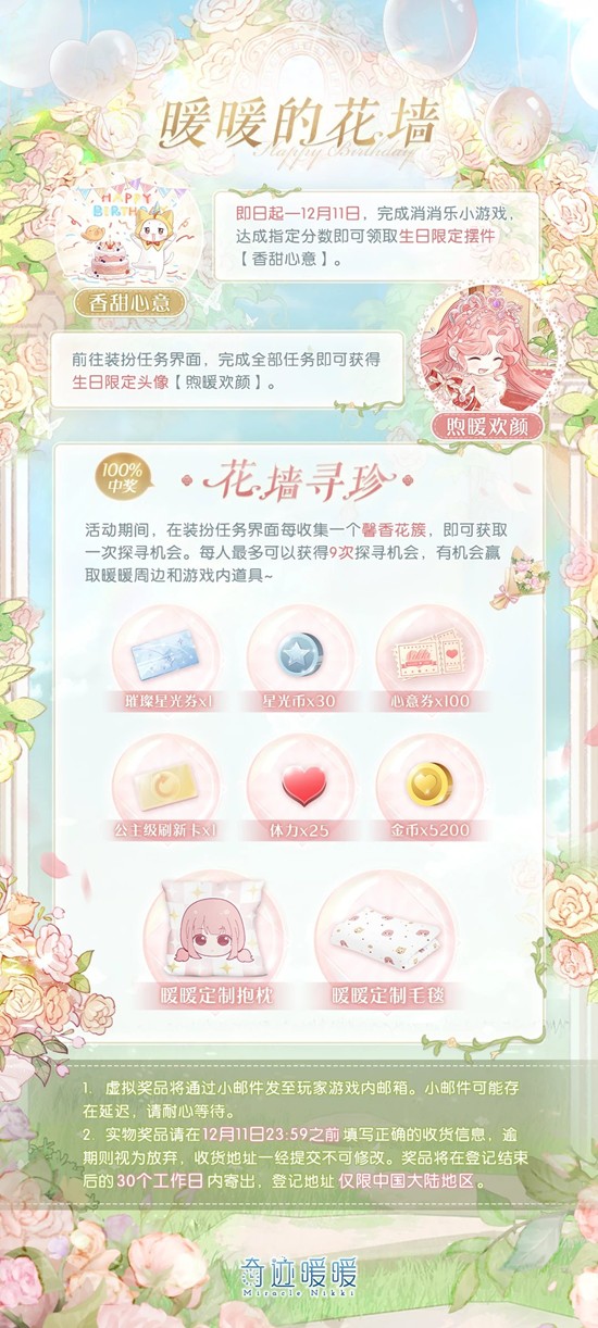 奇迹暖暖【暖暖的花墙】生日主题网页活动现已开启!即日起—12月11日,游戏内点击“活动—限时活动”相关海报进入网页活动,完成消消乐小游戏,达成指定分数即可领取生日限定摆件【香甜心意】。一起来和小编看看吧~