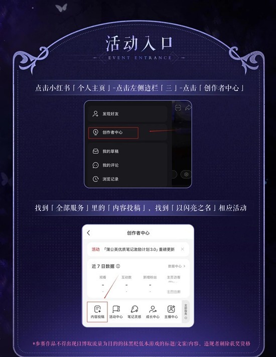 活动入口:小红书「个人主页」-左侧边栏「三」-「创作者中心」-「全部服务」-「内容投稿」
