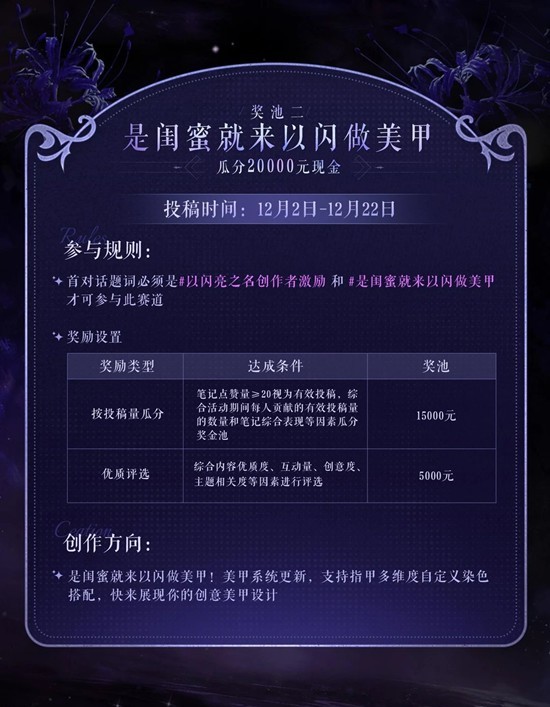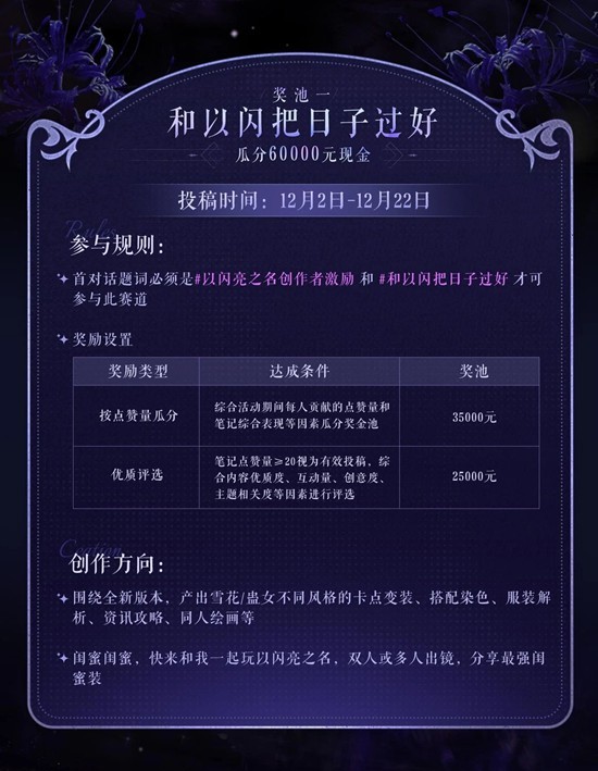 即日起带话题#以闪亮之名创作者激励 和 各赛道指定话题,分享与《以闪亮之名》游戏最新版本相关的精彩创作,即有机会瓜分10万现金奖励。