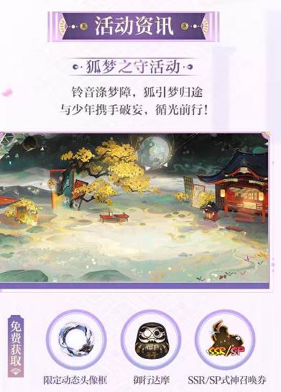 除了主线剧情的更新,新版本还将带来丰富的活动。这些活动包括但不限于「狐梦之守活动」,玩家可以通过参与活动获得限定动态头像框、御行达摩、SSR/SP式神召唤券等奖励。