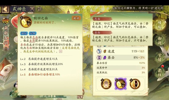 善面:只能给友方施加,每层善面使自身提升20%抵抗,10%减伤。友方行动完,友方增加10%行动条,友方的善面转化为恶面附加敌方,没有恶面优先,再是生命比例较低优先