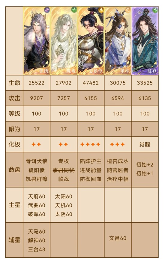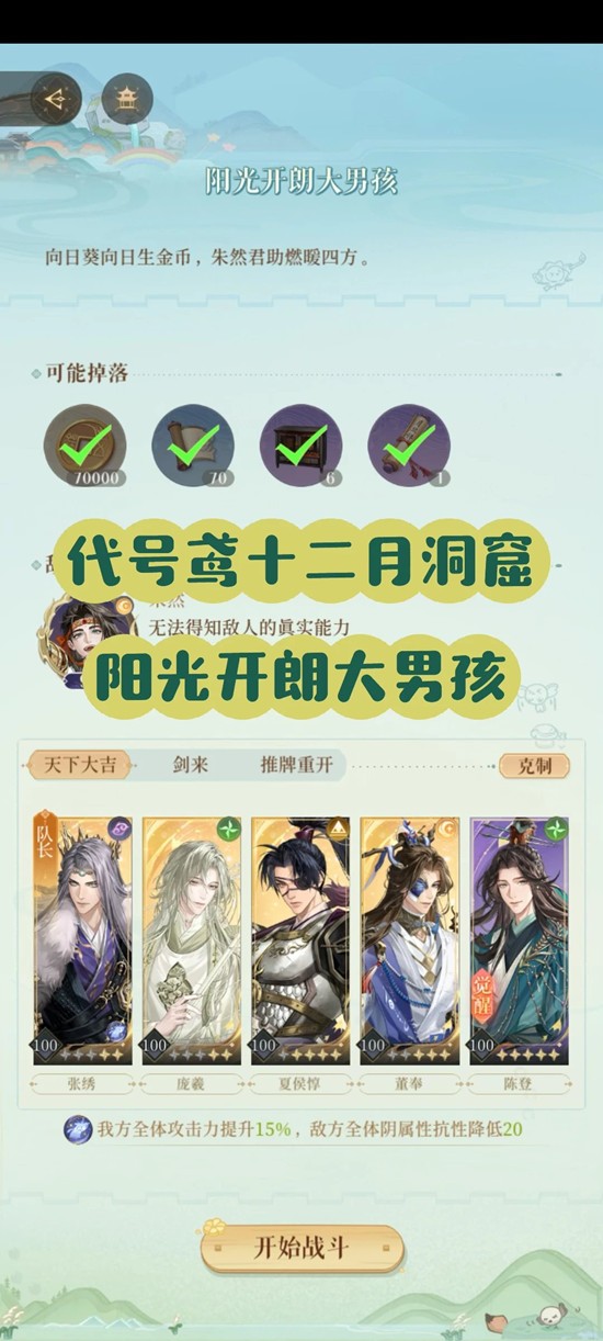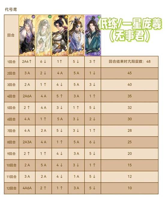 打12回合的时候我把张绣庞羲星石全下了,11回合能结束,12回合是根据前面写的,有误欢迎指出;12回合打不完的话就不能抄表了,我这个亢阳没消完会被秒杀