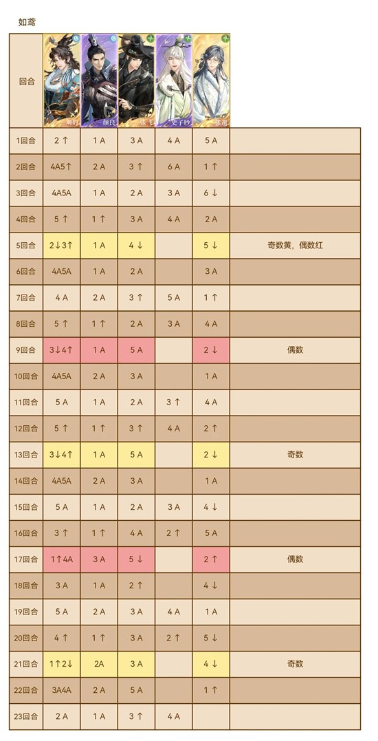 偶数(以8为例) 刘豹1↑张邈2↑颜良3a刘豹4a张飞5↓