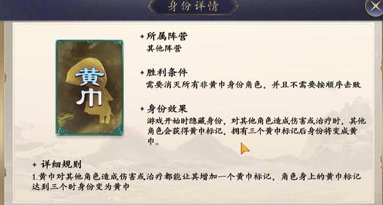 黄巾身份需要消灭场上所有的非黄巾角色才能获胜。该身份在开场时隐藏,当黄巾角色对其他角色使用“杀”或进行回复时,会为其添加一个黄巾印记。印记叠加三次后,该角色的阵营将转变为黄巾。印记效果仅黄巾阵营玩家可见。需要注意的是,主公、明主、先主和潜龙这四个身份无法被转变阵营。此外,当被转变为黄巾阵营的角色数量达到初始人数的一半时,将触发“黄巾起义”,此时所有角色的身份都会被公开,且后续印记效果不再生效。