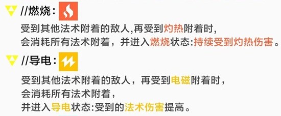 受到其他法术附着的敌人,再受到电磁附着时会消耗所有法术附着,并进入导电状态:受到的法术伤害提高。