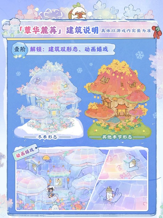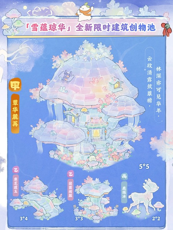 本期限时UP建筑创物池将会上架甲等建筑「蕈华麓苒」。该建筑不仅拥有随季节变换的双形态,还能制作丙等建筑「雪菇团」、「琉璃树」、「素蕊芳」、「揽萤藤」、「雪趣偶」,更有专属头像框和彩蛋期待大家解锁!此外,乙等建筑「寒芝渡玉」、「团菌阁簇」,丙等建筑「鹿蹊冰」也将上架。