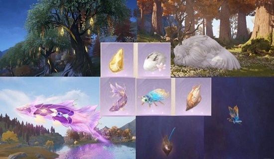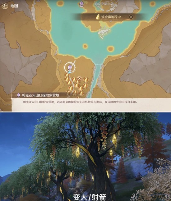采集-流金蜜:传送【帕克亚火山口探险家营地】,地图下方方向有一片树林。可以使用变大套咆哮技能,或者使用弓箭瞄准,把果子打到地上后采集。