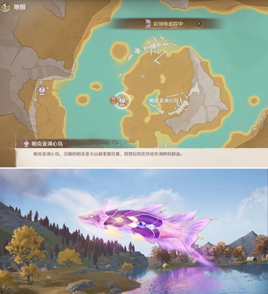 钓鱼-彩翎鱼:传送【帕克亚湖心岛】,湖心岛传送点可以从下方探险家营地坐船过来解锁。传送点旁边断桥尽头的钓鱼点为每日固定点。其余钓鱼点也会有概率出但不是必出。