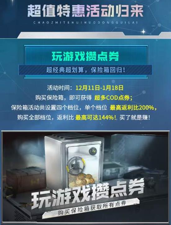 活动持续到1月18日,四档保险箱单笔返利最高200%,四档全买综合收益拉到144%,买完立刻到账COD点券,等于系统倒贴钱给你抽枪皮。