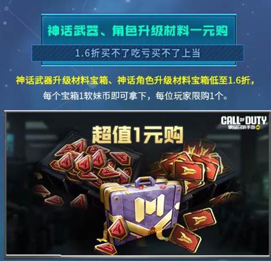 12月11日至17日,特卖中心上架1.6折神话材料箱,1块钱就能把神话武器或角色升级材料抱回家,每人限购1个;36元还可拿下6折神话十连抽,99元档的200使命卡/幸运币/补给卡同样半价,三礼包全部半价,轻松补齐资源缺口。