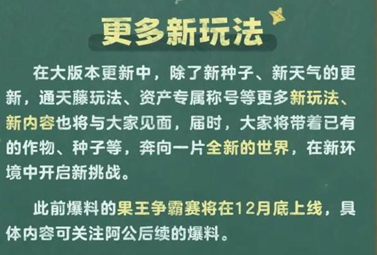 策划“阿公”透露,大版本预计春节前上线,新增“通天藤”爬塔经营玩法、资产专属称号系统、动态天气(雪、沙尘、梅雨)及20余种新作物;原有资源可直接带入新世界,实现“老根发新芽”。此外,12月底将率先推出“果王争霸赛”跨服竞技活动,玩家可携最强作物参赛,争夺年度“果王”限定称号与实物奖励。
