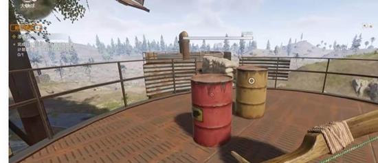 顺着楼梯走到桶的顶部,可以看到两个红色的油桶。使用弓箭远程射碎这些红桶,就能拾取到劣质的原油。收集完此处的原油后,建议在四周探索一下,看看是否有炼油机可以对原油进行加工,进一步提升其价值。