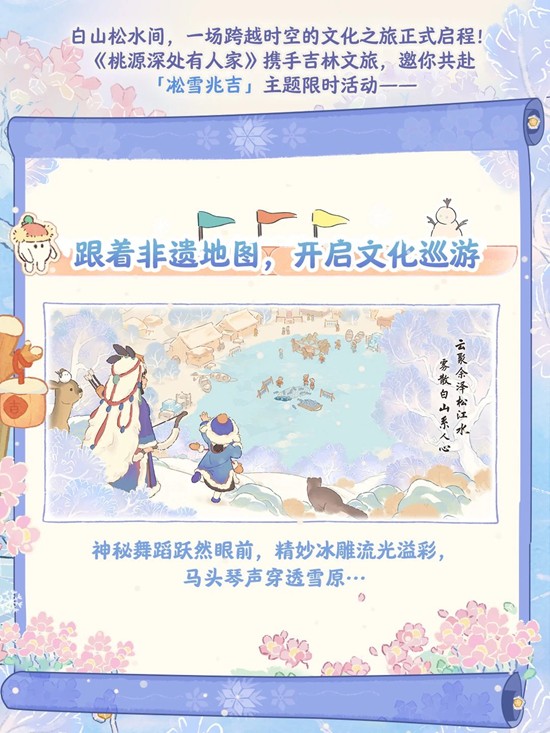 桃源深处有人家x吉林文旅联动,凇雪兆吉雪境巡游现已开启~ 12月11日—1月14日,登陆《桃源深处有人家》吉林主题版本“凇雪兆吉”,探秘白山松水~萝萝们的雪地巡游之旅今日启程,《桃源深处有人家》携手吉林文旅 @悠游吉林(吉林省文旅厅) ,穿越白山松水,解锁非遗奇遇!一起来和小编看看吧~