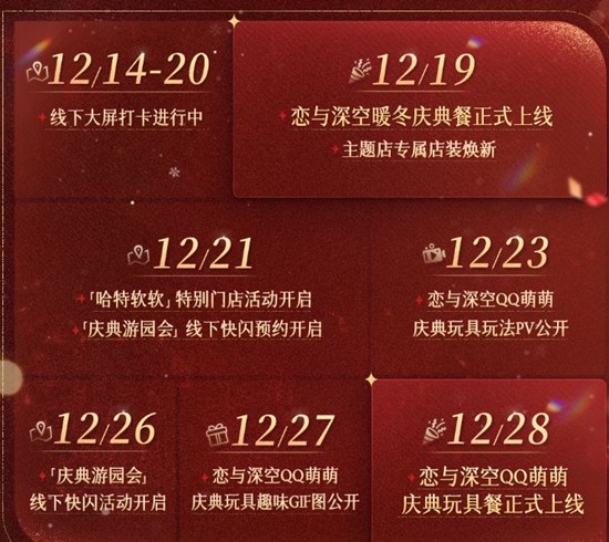 庆典游园会线下快闪:12月26日-12月31日,「庆典游园会」线下快闪营业开启。在这个时间段内,你可以走进快闪店,参与各种有趣的冬日庆典活动,与朋友们一起享受欢乐时光,共同庆祝这个充满爱意的节日季。