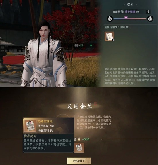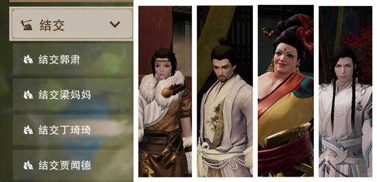 2.100好感+1回合才能结交,每人成功获得500声望,郭肃给800铜板,梁妈妈20魅力,贾闻德20才学,丁琦琦20武学(除郭肃外,其余三人东西也可以各回收300铜板)。