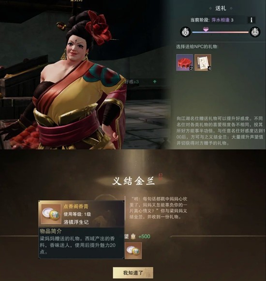 1.游戏里有四个可结交人物(日程点结交可前往),郭肃喜欢古董,梁妈妈喜欢布料,贾闻德喜欢文学,丁琦琦喜欢武功秘籍。