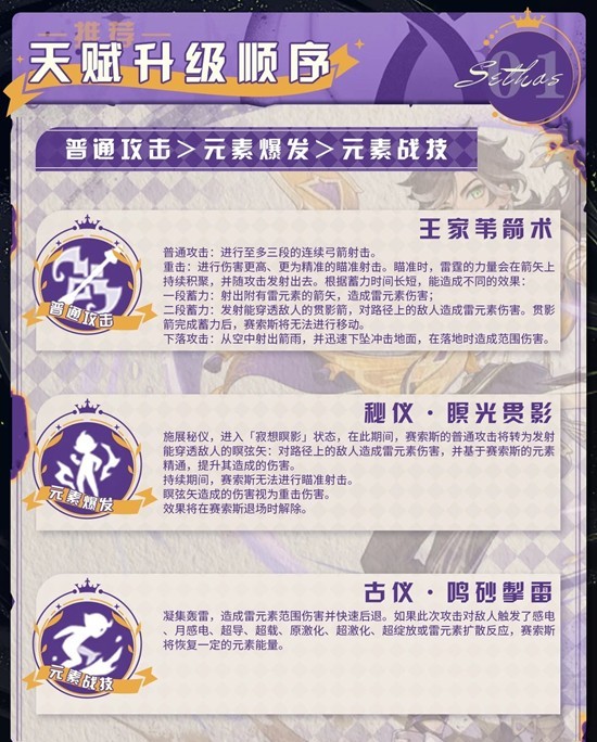 满足以下任意一项条件时,赛索斯的雷元素伤害加成提升15%,持续10秒,至多叠加2层,每层独立计时:通过瞄准射击消耗元素能量,此条件需要解锁固有天赋「黑鸢的密喻」通过古仪·鸣砂掣雷触发元素反应恢复元素能量;施放秘仪·瞑光贯影。
