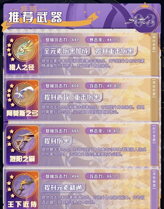 提供暴击率加成,特效可提升角色重击对单体/群聚敌人造成的伤害。同时,该武器外观与赛系斯较为适配。