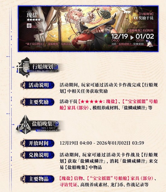 兑换说明:活动期间,玩家可通过活动关卡作战及【行船规划】获取「盐鳞咸鳞汁」,消耗「盐鳞咸鳞汁」来交易【盐船晚集】中物品