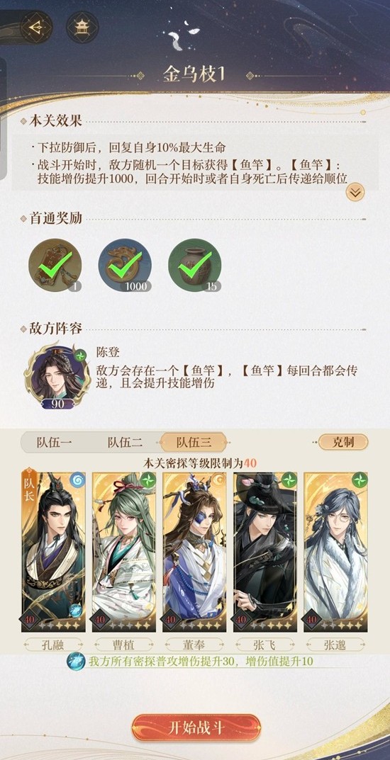 遗迹一普攻队常规打,你可以全员压血到最后一口气斩杀,也可以先杀陈登再杀小兵,更可以先杀小兵再杀陈登,曹植陈登同步放大,其他人随意,注意控制小兵能量