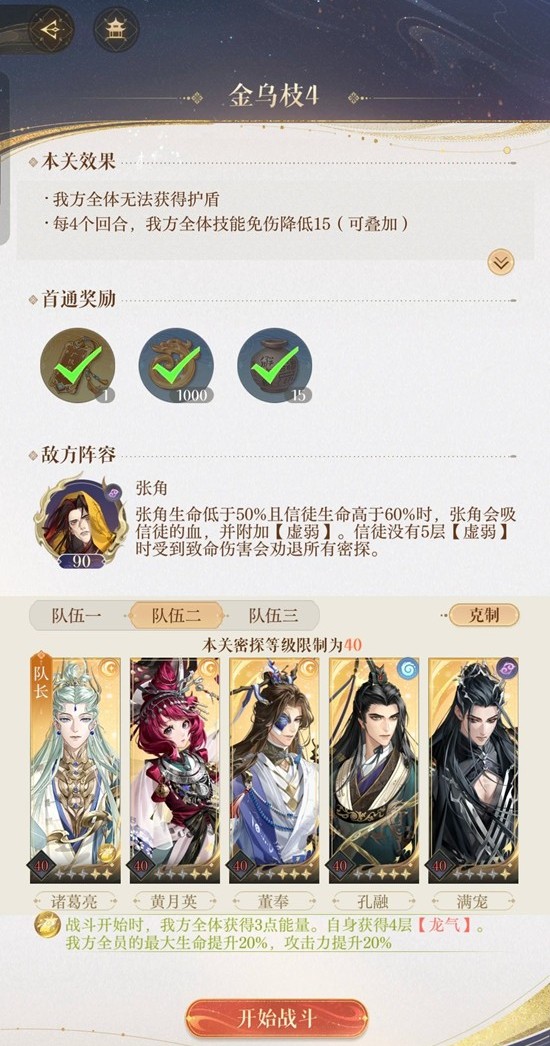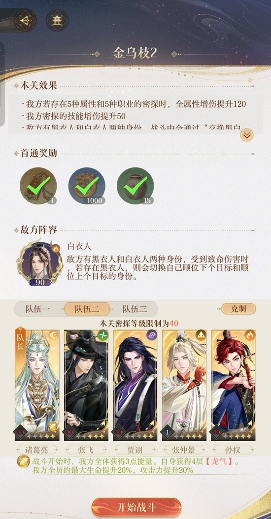 遗迹二全员凑五职业五属性,建议要么阳神乾纪诸葛亮核心。要么地破军安期核心,这里张仲景凑数,死了没事先打一号位,再打五号位。全员变白后乱杀,注意对面开大前他们不能减员,或者他们开大前全员无