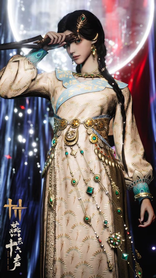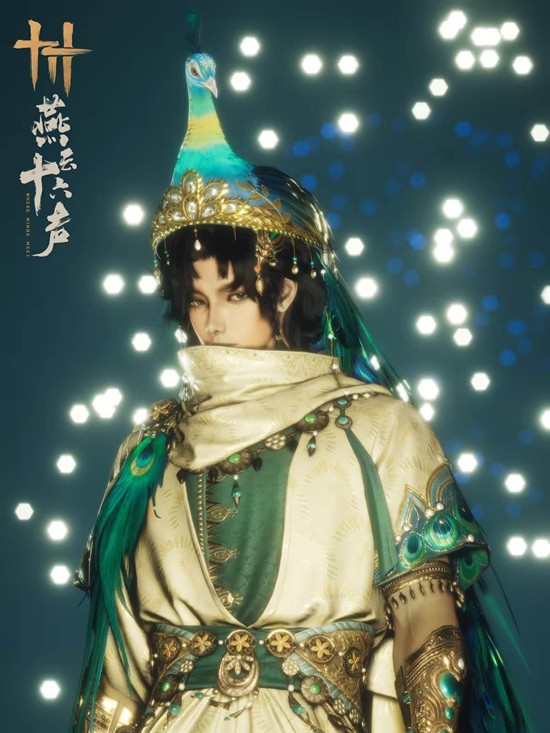 套装以翠蓝孔雀翎为纹,配饰随步伐流光转动,异域风韵与神秘气息并存;头饰则采用开屏动态设计,侧顾时羽尾轻摇,宛如孔雀栖于云鬓,增添翩然雅致。