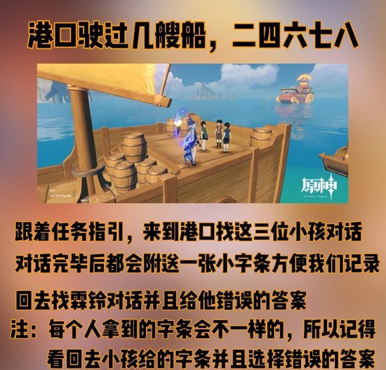 •霖铃建议我们去问港口的三位小孩,由于小孩子的话可能有偏差,所以要我们每个孩子都问一遍