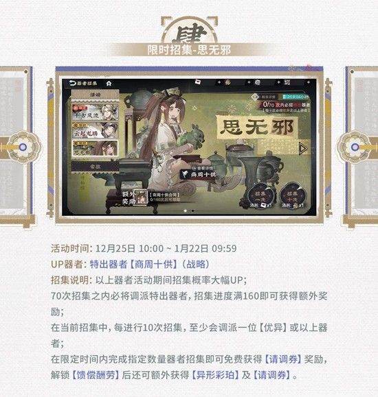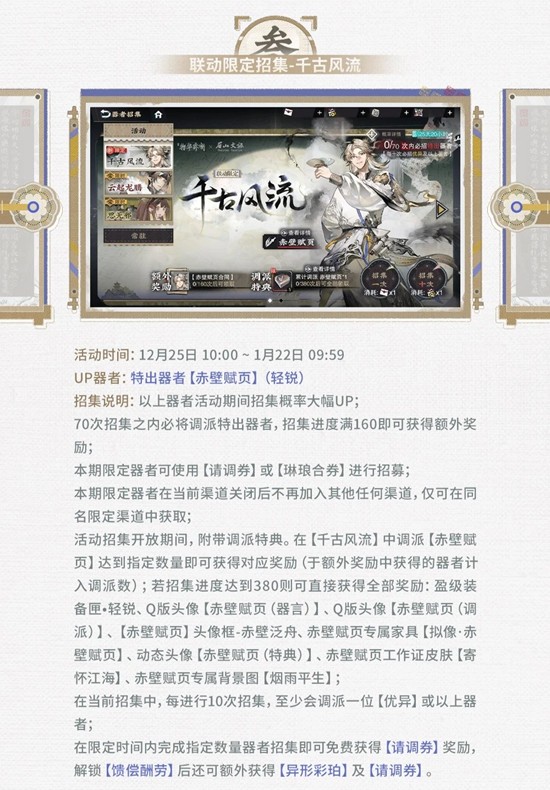 UP器者:特出器者【赤壁赋页】(轻锐)招集说明:以上器者活动期间招集概率大幅UP;70次招集之内必将调派特出器者,招集进度满160即可获得额外奖励;