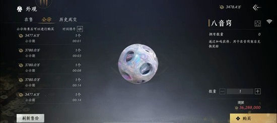 “商店”-“交易”下有玩家挂出的八音窍、武器、往期和鸣等。以八音窍为例,上架商品首先在“公示”区公示24小时,之后进入“在售”区。一般不要直接买“在售”商品,这里很多是价格贵了堆积,暂时没人买的。更建议在“公示”区挑价格合适的,等待倒计时结束后去“在售”区抢。公示区可按价格或时间排序,从最近的八音里挑一个价格能接受的。公示倒计时快结束时,换到在售页面开始刷新,商品出现后立刻点购买就好。如果开了交易锁记得提前关闭,否则会弹出密码框。