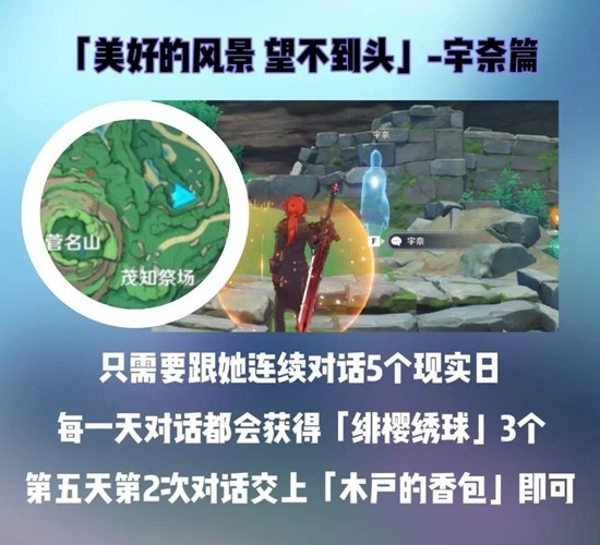 - 任务需求:准备绯樱绣球,需要连续做5天,他会给一个「木户的香包」