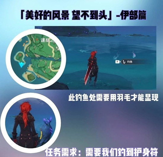 - 任务需求:帮他找到护身符(到逢嶽之野左下角小岛,用羽毛激活雷鸟雕像触发钓鱼池,直到钓到「牧梨的护身符」(这是随机出現的,如果钓完魚了还沒有出現可以调整時間继续),之后再次与他对话