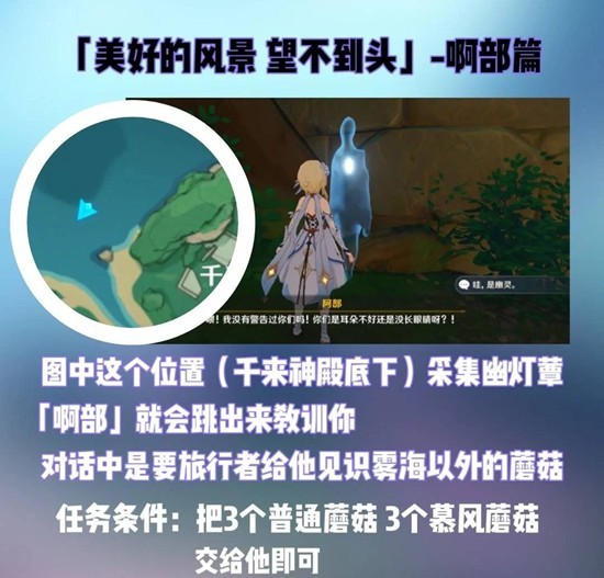 - 触发任务: 在採光图中点位的幽燈蕈(蓝色蘑菇)之后「阿部」会出现