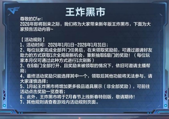 哈喽,各位CFer大家好呀!2026年即将到来,在这辞旧迎新之际,CF手游推出新年版王炸黑市活动,所有玩家可邀请好友助力刷新一次奖励,一起来看看吧!