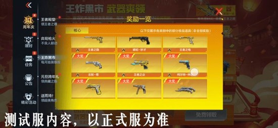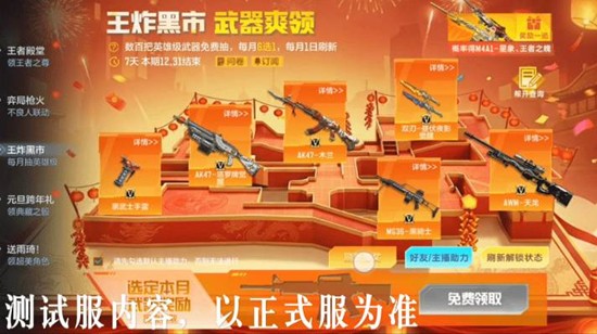 此外,王炸黑市自2026年1月起,在原有武器奖励的基础上增加了更多武器大奖,主要包括三国系列的副武器、近战武器以及王者系列的投掷武器,玩家们获得武器大奖的概率也将有所提升。